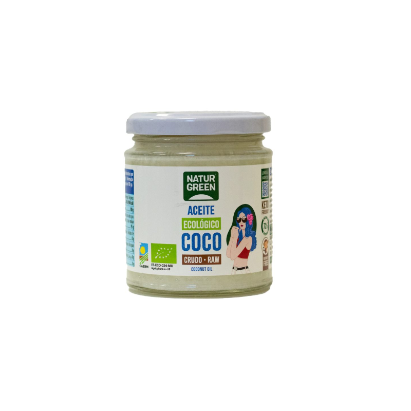 Aceite de coco BIO 200gr (Naturgreen) ecológico suave y aromático de calidad Premium, prensado en frío a partir de la pulpa de cocos recién recolectados procedentes de cultivo sostenible. Por supuesto no está sometido a ningún proceso de hidrogenación.