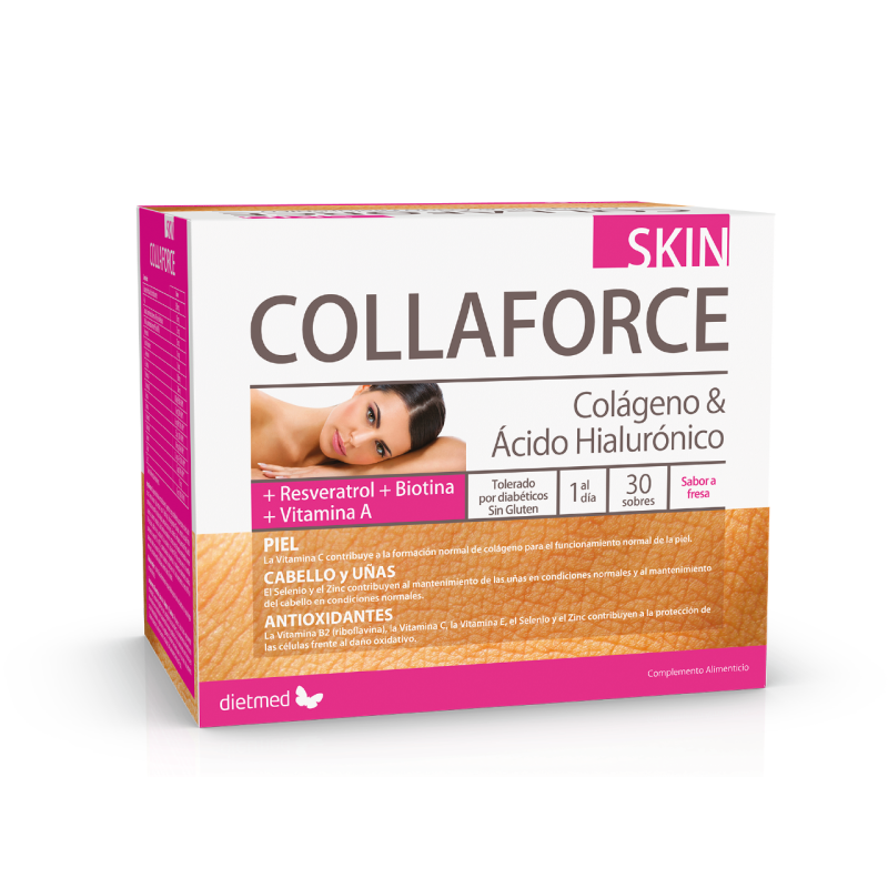Skin Collaforce 30 sobres (DietMed) es un suplemento que te permite fortalecer los niveles de colágeno, ayudando a reducir algunos efectos del envejecimiento, como la piel delgada, relativamente aplanada, seca y libre de imperfecciones con cierta pérdida de elasticidad y pérdida de regularidad arquitectónica relacionada con la edad.