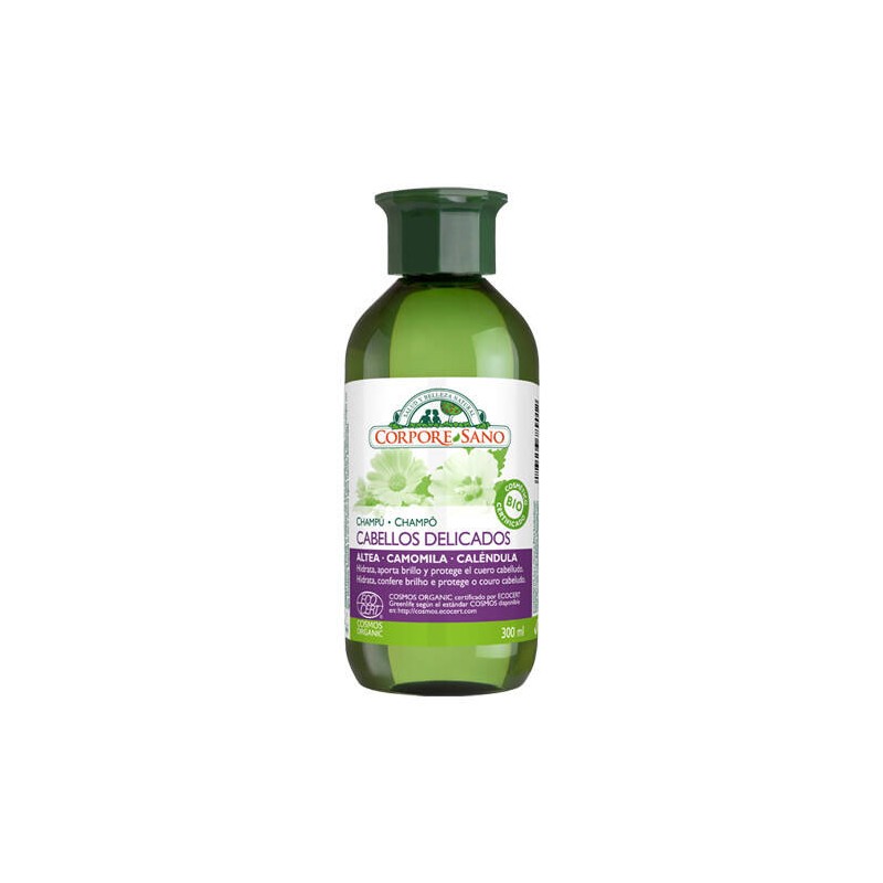 Champú Cabellos Delicados con Altea, Camomila y Caléndula de Corpore Sano. Champú con certificado Cosmos Organic que hidrata, aporta brillo y protege el cuero cabelludo. Los extractos de Altea, Camomila y Caléndula confieren a este champú unas propiedades protectoras extraordinarias. El cabello se muestra hidratado y protegido tras su uso.