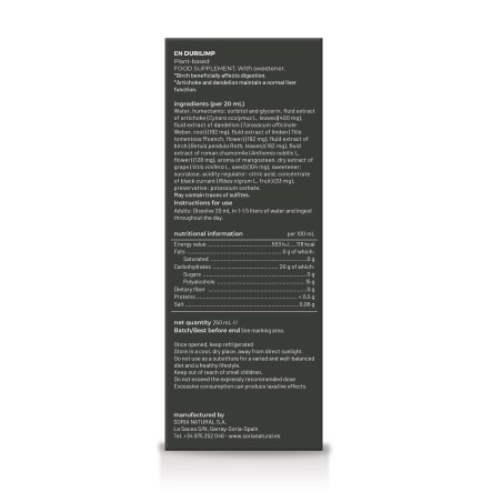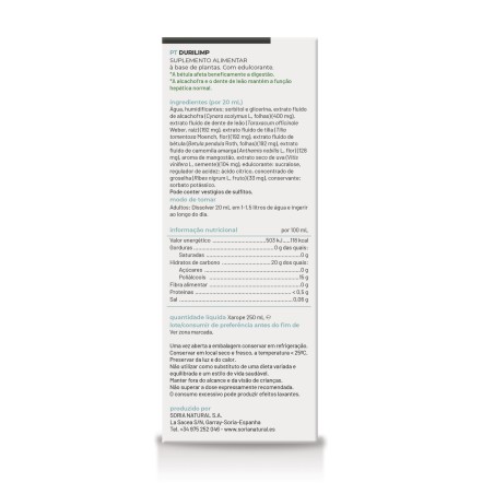 La combinación de alcachofa, abedul, diente de león, tila, manzanilla amarga y extracto de semillas de uva hace que Durilimp sea un producto eficaz como coadyuvante en dietas de adelgazamiento y en curas depurativas.