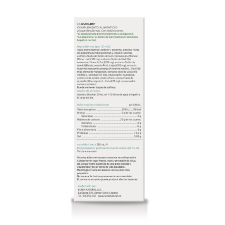 Durilimp de Soria Natural es un complemento nutricional que ayuda a depurar el organismo y contribuye a eliminar líquidos y grasas.