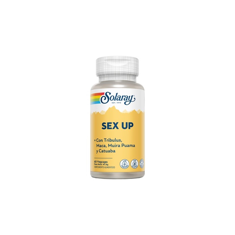 Sex Up 60 Vegcaps de Solaray es un complemento alimenticio a base de plantas afrodisíacas, diseñadas para aumentar la sensación de bienestar y la líbido.