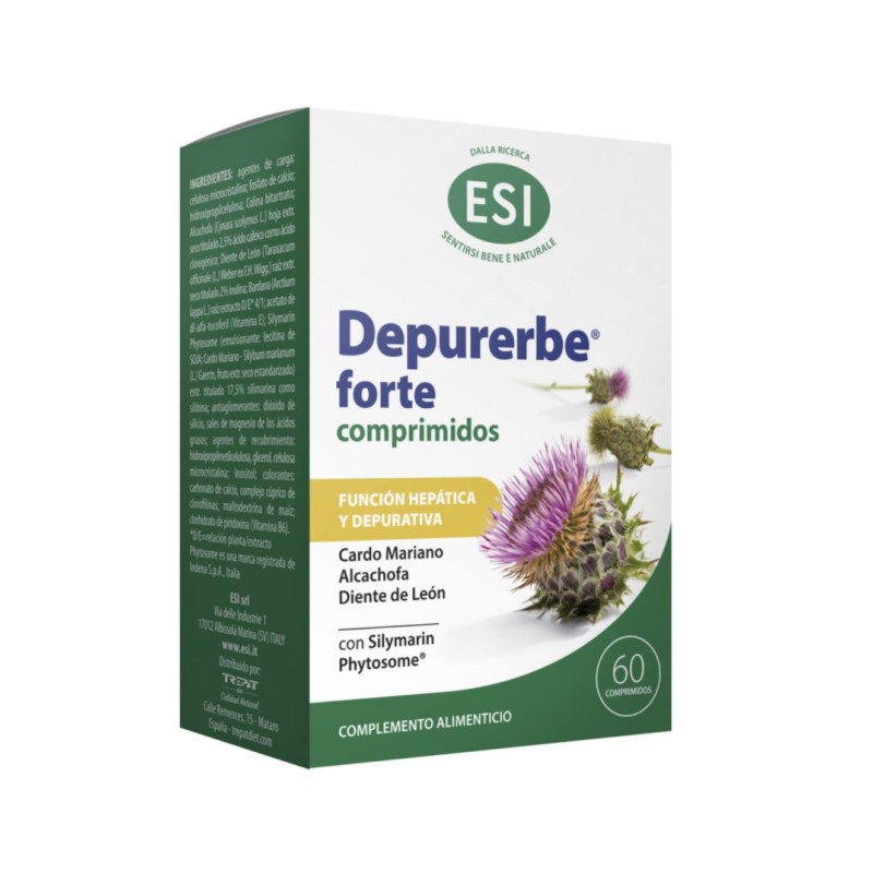 Depurerbe Forte Comprimidos de ESI es un depurativo Hepático con Silymarin Phytosome® con una potente acción hepatoprotectora, reforzada con la colina e inositol. Apoyan las funciones hepáticas y desintoxican y depuran el organismo.